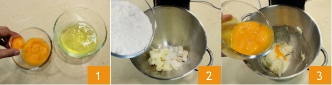 Para preparar la tarta golosa de cacao, empieza por la masa: separa las yemas de las claras 1; en una batidora (puedes usar también una batidora eléctrica) pon la mantequilla en trozos y añade la mitad de la dosis de azúcar glas 2. Trabaja la mezcla y una vez que esté homogénea y espumosa, añade las yemas poco a poco 3, haciendo que la batidora trabaje hasta que estén completamente integradas.