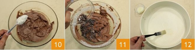 Añade también la harina tamizada junto con la levadura, poco a poco ayudándote con una cuchara 10, mezcla cuidadosamente y finalmente añade las pepitas de chocolate 11. Unta con mantequilla un molde de 28 cm de diámetro 12 y enharínalo.
