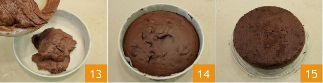 Luego vierte la masa 13 y nivélala con una espátula sin golpear el molde para evitar que se desmonte la mezcla. Hornea en horno estático precalentado a 175°C durante unos 45 minutos (155°C durante aproximadamente 35 minutos si es horno ventilado). Cuando el dulce esté cocido, retíralo del horno 14 y deja templar, luego desmóldalo, volteándolo y déjalo enfriar completamente sobre una rejilla 15.
