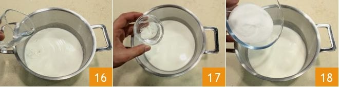 Mientras tanto, prepara el glaseado de cacao: pon la gelatina a remojar en un bol con agua fría, durante al menos 10 minutos. Luego, en una cacerola grande, vierte la nata, añade la dosis de agua 16, el glucosa 17 y el azúcar 18: mezcla y lleva a ebullición a fuego lento.