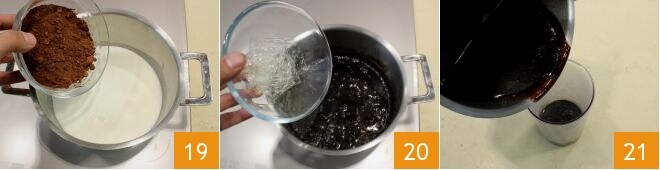 Luego apaga el fuego y añade el cacao en polvo 19, mezcla y vuelve a poner a fuego lento para llevar la mezcla nuevamente a un ligero hervor. Deja templar unos minutos, luego escurre cuidadosamente las hojas de gelatina remojadas previamente y únelas al glaseado 20, mezcla hasta la completa disolución de la gelatina. Vierte el glaseado en un recipiente alto 21