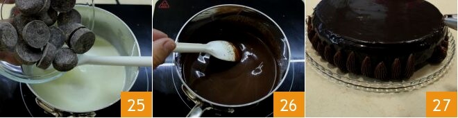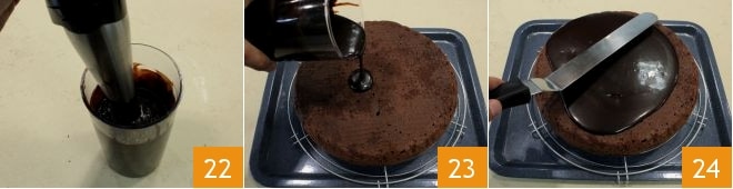 y tritúralo 22. Puedes poner el glaseado a enfriar en la nevera durante al menos 1 hora. Pasado el tiempo necesario podrás verter el glaseado sobre la tarta 23 (manteniendo la tarta sobre la rejilla y colocando una bandeja debajo conseguirás cubrirla uniformemente y no ensuciar la superficie de trabajo). Extiende el glaseado sobre la superficie y los lados ayudándote con una espátula 24. Luego pon la tarta en la nevera durante unos minutos para que se solidifique el glaseado.