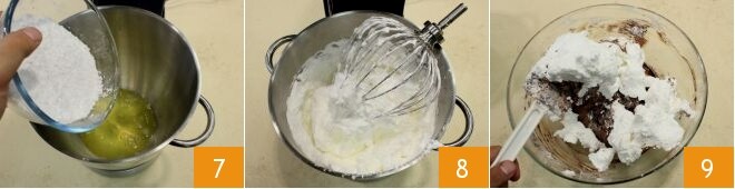 Aparte, monta las claras con el azúcar con la mitad restante de azúcar glas (7-8), luego únelas al resto de la mezcla mezclando suavemente de arriba hacia abajo 9.