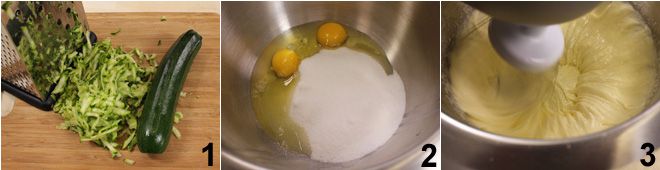 Para preparar la tarta dulce de calabacín, empieza lavando los calabacines, eliminando los extremos y rallándolos con un rallador de agujeros grandes 1; luego escúrrelos ligeramente para quitar el exceso de agua. Bate los huevos enteros con el azúcar 2 hasta obtener una mezcla clara y espumosa 3,