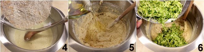 luego añade la harina 00, la de avellanas (o de almendras) y la levadura bien tamizadas, y también las semillas de la vaina de vainilla 4. Añade también el aceite de semillas 5, mezclando bien para integrarlo y por último los calabacines rallados 6.