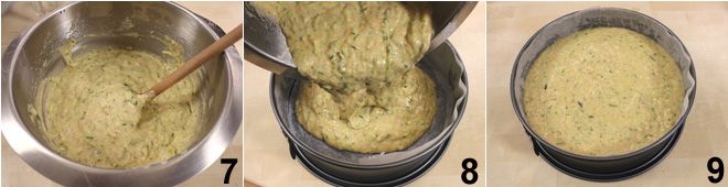 Mezcla todo 7 y vierte la mezcla obtenida en un molde de 24/26 cm engrasado y enharinado (o cubierto con papel de horno) (7-8). Hornea la tarta de calabacín durante unos 60 minutos a 180°C (horno estático), comprobando con un palillo si está cocida antes de sacarla del horno. Si se oscurece demasiado en la superficie después de los primeros 40 minutos de cocción, cúbrela con una hoja de aluminio. Deja enfriar la tarta dulce de calabacín antes de desmoldarla. ¡Sírvela espolvoreada con azúcar glas!