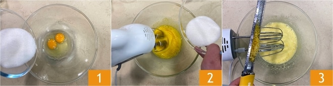 Para preparar la tarta en sartén, como primer paso poned en un bol los huevos y aproximadamente la mitad del azúcar 1. Comenzad a trabajar con las varillas eléctricas y verted gradualmente también el azúcar restante 2. Continuad trabajando con las varillas hasta que los huevos estén claros y espumosos. Agregad luego la cáscara rallada del limón 3.