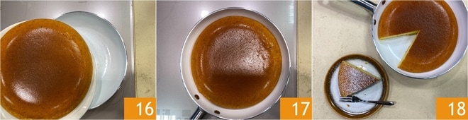 Dejad deslizar la tarta dentro de la sartén 16 y dejad cocinar durante otros 15 minutos, siempre a la misma temperatura, pero esta vez sin tapa 17. Una vez cocida, dejad enfriar, espolvoread con azúcar glas y servid vuestra tarta en sartén 18!
