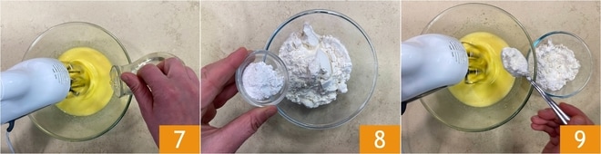 Ahora disminuid la velocidad del batidor y verted lentamente el aceite en hilo 7. En un pequeño bol mezclad la harina con la levadura 8 y tamizadlas. Poco a poco incorporad los polvos a la mezcla, siempre con las varillas a baja velocidad 9.