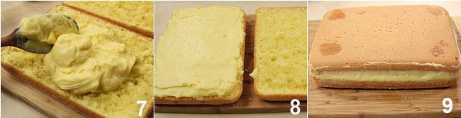 Prepara la crema pastelera (para ver cómo hacer haz clic aquí), aromatizando la leche que habrás puesto a calentar en un cazo junto con la nata y la cáscara rallada del limón ecológico; cuando la leche llegue a ebullición, cuélala y procede normalmente con la preparación de la crema pastelera clásica. Déjala enfriar poniéndola en el frigorífico dentro de un recipiente y cubriéndola con film transparente que debe estar en contacto con la crema misma (esto para evitar que se forme la clásica capa dura en la superficie). Una vez fría, úntala sobre una mitad de la tarta 7 reservando una cucharada. Nivélala bien 8 y cubre la crema con la otra mitad de la tarta. Con la cucharada de crema pastelera de limón reservada, iguala bien los bordes laterales donde hubiera zonas sin crema 9.