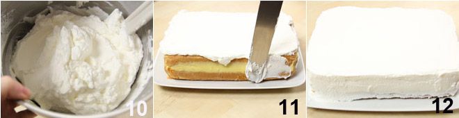 Prepara la crema chantilly montando la nata a punto de nieve junto con el azúcar glas (haz clic aquí para ver cómo hacer) 10. Con un cuchillo de hoja lisa, unta la crema chantilly sobre toda la superficie de la tarta, incluidos los bordes 11, asegurándote de extenderla de manera uniforme sobre la parte superior 12.