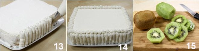 Luego introduce en una manga pastelera equipada con una boquilla de estrella, la crema chantilly restante y comienza la decoración de la tarta, haciendo surtidos verticales en los lados 13; completa con montoncitos de crema chantilly sobre los surtidos, a lo largo de todo el perímetro de la tarta. Pasa luego a la decoración con la fruta, limpia y pela los kiwis y córtalos en rodajas de un grosor de aproximadamente 2-3 milímetros 15.
