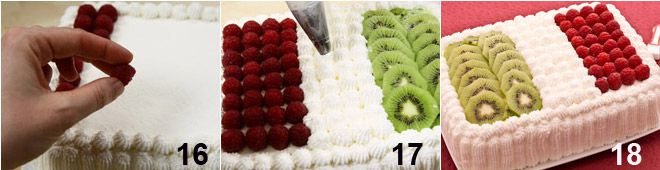Lava las frambuesas y sécalas muy delicadamente, luego colócalas en la parte superior de la tarta, disponiendo 4 filas de 8. Coloca las frambuesas una a una de manera muy regular 16. Una vez obtenida la banda roja, decora con montoncitos de chantilly para formar la parte blanca central de la bandera. Completa disponiendo las rodajas de kiwi 17. Aquí tienes: ¡tu tarta Italia está lista para ser disfrutada no solo con el paladar sino también con los ojos! Coloca la tarta en el frigorífico durante al menos una hora antes de disfrutarla y.....