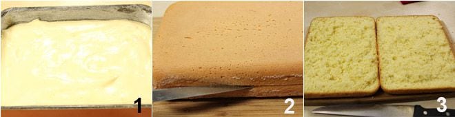 Para preparar la tarta Italia comienza con la preparación del bizcocho clásico. Con una batidora, un robot de cocina o una amasadora, bate durante mucho tiempo los huevos con el azúcar, luego añade la harina y la fécula tamizadas. Para ver los detalles de la preparación haz clic aquí. Engrasa y enharina un molde rectangular de tamaño 20 por 25 cm y vierte la masa en su interior 1; hornéalo en un horno precalentado estático a 180 grados durante 30-35 minutos. El bizcocho estará cocido cuando se despegue de los bordes y cuando al pincharlo con un palillo este salga completamente seco. Una vez que el bizcocho esté cocido, déjalo enfriar y desmóldalo. Corta el bizcocho por la mitad utilizando un cuchillo de hoja larga (2-3).