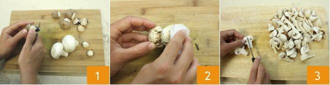 Para preparar la tarta salada de polenta, comienza con los ingredientes que constituirán el relleno. Primero, ocupaos de la limpieza de los champiñones: elimina los restos de tierra presentes en los porcini y los champiñones (1-2). Una vez limpios y lavados, corta los champiñones en cuartos 3 y resérvalos en un bol.