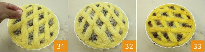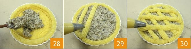 Ahora vierte el relleno en el centro 28 y uniforma con el dorso de una cuchara de madera. Usando siempre la manga pastelera, forma los clásicos rombos de la tarta (29-30).