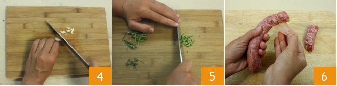 Ahora pela un diente de ajo y pícalo finamente 4, luego deshoja las ramitas de romero y tomillo y pica finamente las agujas y las hojitas 5. Finalmente, haz una incisión delicada en la tripa de la salchicha y desgránala 6, eliminando la piel y recogiendo la carne en un bol.