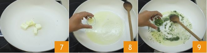 En este punto, derrite la mantequilla en una sartén grande 7, añade el picadillo de ajo 8 y el picadillo de romero y tomillo 9 y deja sofreír a fuego lento unos minutos.