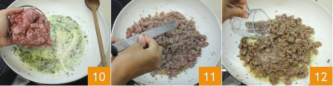 Vierte en la sartén la salchicha y deja cocinar durante 10 minutos 10. Durante la cocción, sazona todo rallando la nuez moscada 11, si quieres puedes añadir directamente la que está en polvo, y desglasa con el vino blanco 12.