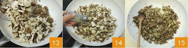 Transcurrido este tiempo, añade los champiñones cortados que habías reservado 13, reservando algunos para la decoración final de la tarta, y ajusta de sal y pimienta al gusto 14, luego deja cocinar durante otros 15 minutos a fuego bajo, cubriendo con una tapa, hasta que estén ligeramente marchitos 15. Apaga el fuego y reserva.