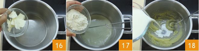 Ahora prepara la bechamel: vierte la mantequilla en una cacerola con bordes altos 16 y déjala derretir a fuego lento. Una vez derretida, añade la harina ya tamizada 17 y deja cocinar un par de minutos, continuando a mezclar para evitar que la harina se pegue al fondo. Luego añade la leche 18, que has calentado previamente, y sigue mezclando.