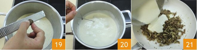 Sazona con una pizca de sal y pimienta y una espolvoreada de nuez moscada rallada 19 o en polvo, luego coloca una tapa sobre la cacerola y deja cocinar durante unos 15 minutos, hasta que la bechamel se haya espesado 20. Para preparar y conservar la bechamel de la mejor manera, consulta nuestra receta aquí. Una vez lista, vierte la bechamel en el relleno de salchicha y champiñones 21 y mezcla para amalgamar todo.