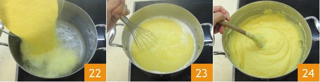 Encárgate de la polenta: llena una cacerola grande de agua, salarla, vierte un hilo de aceite y lleva a ebullición. Luego vierte la polenta en forma de lluvia 22 y comienza a girar enérgicamente con un batidor 23. Continúa mezclando con una cuchara de madera hasta que la polenta haya alcanzado una consistencia densa 24. Apaga el fuego y deja enfriar. Para descubrir cómo preparar y conservar de la mejor manera la polenta, consulta la receta aquí.