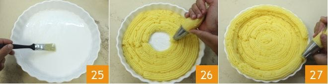 Mientras tanto, unta con mantequilla un molde de 27 cm de diámetro, ayudándote con un pincel 25, luego transfiere la polenta a una manga pastelera con punta de estrella y crea el fondo de la tarta, formando círculos concéntricos 26. Finalmente, dibuja el borde de la tarta exprimiendo la polenta a lo largo del perímetro del molde 27.