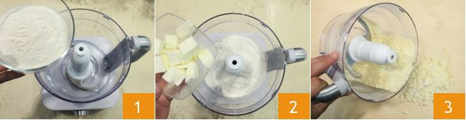 Para realizar la tarta salada comienza con la preparación de la masa brisa: pon en la batidora con cuchillas la harina 1, la mantequilla en trozos fría 2, una pizca de sal y mezcla todo hasta obtener una mezcla con apariencia de arena gruesa y harinosa. En este punto, distribuye la mezcla obtenida sobre una superficie de trabajo 3