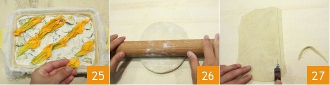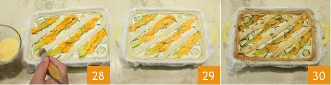 Aplica ahora las tiras obtenidas sobre la superficie de la tarta siguiendo la línea de las flores de calabacín. Pinta la superficie de la tarta con una emulsión de huevo batido y leche (28-29) y hornea en horno estático precalentado a 170° durante 55 minutos o en horno ventilado a 160° durante 45 minutos. Cuando la tarta esté dorada en la superficie, sáquela del horno 30. Disfruta de tu tarta salada de ricotta y flores de calabacín tibia.