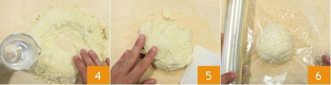 en la clásica forma de volcán 4 y amasa todo rápidamente añadiendo poco a poco agua fría hasta obtener una masa compacta y bastante elástica 5. Una vez lista, envuelve tu masa brisa en un film de cocina 6 y deja que repose en la nevera durante al menos 40 minutos.