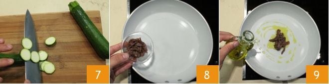 Ahora dedícate al relleno: lava y seca los calabacines, quita los extremos, reserva las flores y corta los calabacines en rodajas 7. Pon al fuego una sartén, añade las anchoas 8, cúbrelas con un hilo de aceite 9,