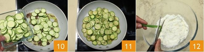 añade los calabacines cortados en rodajas 10, sala, pimienta y saltea los calabacines en la sartén a fuego medio durante unos minutos, no deben cocinarse completamente sino permanecer ligeramente crujientes, déjalos templar 11. En un bol grande vierte la ricotta, añade 3-4 tallos de cebollino cortados finamente con las tijeras 12,