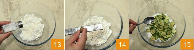 sala 13, aromatiza con una pizca de nuez moscada rallada 14. Añade los calabacines y mezcla la mezcla con una cuchara 15.
