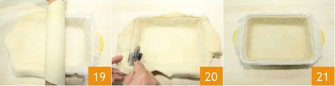 Envuelve la lámina en el rodillo y desenróllela sobre el molde 19, presiona en todos los lados y en el fondo del molde para que se adhiera la masa, con una rueda cortapasta elimina los bordes sobrantes (20-21).