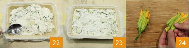 Vierte el relleno de ricotta y calabacines en el molde, nivela la mezcla con el reverso de una cuchara (22-23), toma las flores de calabacín, lávalas sumergiéndolas en un bol con agua fría, sécalas sobre un paño de cocina. Una vez secas, quita las protuberancias manteniendo la copa inferior, elimina el tallo y el pistilo interno 24.