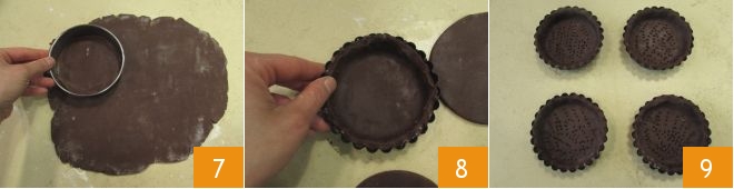Transcurrido el tiempo de reposo, precalienta el horno a 200° en modo estático. Mientras el horno alcanza la temperatura necesaria, extiende la masa con el rodillo en una superficie ligeramente enharinada hasta un espesor de aproximadamente 5 mm. Toma un cortador de galletas de 11 cm de diámetro y saca 4 discos de la masa obtenida 7. Coloca cada disco dentro de un molde para tartaletas con borde ondulado de 10 cm de diámetro 8, luego pincha el fondo con los dientes de un tenedor 9. Hornea las tartaletas en el horno estático precalentado a 200° durante unos 20 minutos (los tiempos pueden variar ligeramente según la potencia del horno que poseas), colocándolas en la rejilla del medio. Cuando estén listas, sácalas del horno y deja que se enfríen.