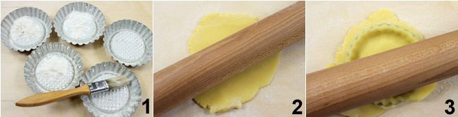 Unta con mantequilla y enharina bien 6 moldes de tartaleta de aproximadamente 8 cm de diámetro cada uno 1. Después del reposo en el frigorífico, extiende la masa quebrada en una lámina de aproximadamente 3 mm de grosor con la ayuda de un rodillo 2, córtala en cuadrados de aproximadamente 10 cm de lado y coloca cada cuadrado de lámina sobre los moldes de tartaleta, haciendo que se adhiera bien al fondo y a los lados de los moldes. Finalmente, elimina la masa sobrante ayudándote con un rodillo 3.