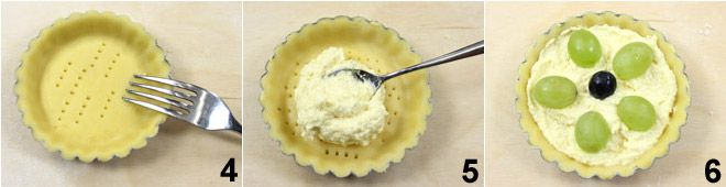 Pincha el fondo de las tartaletas con los dientes de un tenedor 4 y coloca en cada una una cucharada abundante de crema frangipane 5, que luego nivelarás con el dorso de la misma cuchara. Lava las uvas blancas y corta los granos a la mitad (si hay, elimina las semillas internas). Coloca las mitades de los granos sobre la crema frangipane, formando los pétalos de una flor. Coloca en el centro de cada flor un pequeño grano de uva negra 6.