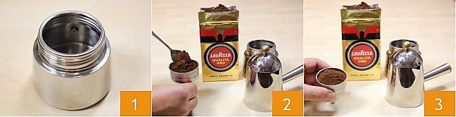 Para realizar las trufas de café y cardamomo, comenzad preparando el café con la cafetera: llenad la caldera de vuestra cafetera con agua fría y, si es posible, con poca cal, teniendo cuidado de no sobrepasar la válvula de seguridad 1 (de lo contrario obtendréis un café más largo). Llenad el filtro con el café molido formando una montañita que nivelaréis golpeando el filtro sobre la mesa con movimientos firmes (2-3). No presionéis con la cucharilla, ni hagáis agujeros en la superficie.