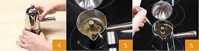 Cerrad muy bien la cafetera 4, de modo que el café no se salga por los lados mientras sube, y ponedla en una llama baja y constante para obtener un café con cuerpo. A medida que sube el café, se formará una espuma densa 5: os recomendamos no dejar que el café burbujee demasiado tiempo para mantener intacta su dulzura y aroma. Vuestro café está listo: antes de usarlo, mezcladlo directamente en la moka con una cucharilla para hacerlo más homogéneo 6. Una vez listo, reservad el café.