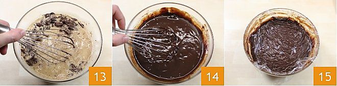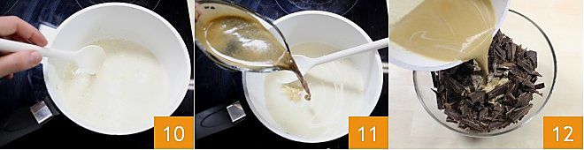 y mezclad con una cuchara 10, calentad todo y luego añadid también el café de la moka previamente preparado 11. Verted la mezcla en el bol que contiene el chocolate picado 12 y