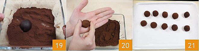 Una vez formada cada trufa, hacedla rodar en el bol con el cacao y el café en polvo (19-20), una vez lista, colocadla en una bandeja cubierta con papel de horno 21. Trabajad las bolas rápidamente para evitar que el calor de las manos ablande demasiado la masa. Proceded de esta manera hasta agotar la mezcla, con las cantidades indicadas obtendréis unas 25 trufas. Ahora que vuestras trufas de café y cardamomo están listas, disfrutadlas con una buena taza de café.