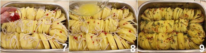 pica una guindilla roja sin semillas y espárcela sobre la fuente 7. Finalmente, unta las patatas con la mezcla de mantequilla y aceite previamente preparada 8. Hornea a 200°C durante unos 60 minutos, después saca la bandeja del horno, esparce las hojas de tomillo sobre las patatas 9 y échales sal. Vuelve a poner la bandeja en el horno otros 15/20 minutos hasta que las patatas estén cocidas y bastante crujientes en la superficie!
