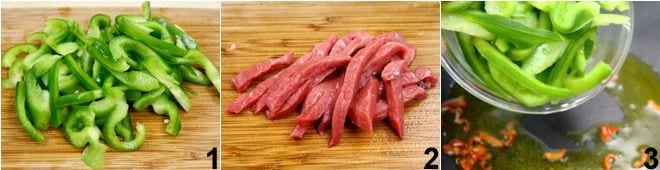 Para preparar la ternera picante, comienza lavando un pimiento, córtalo a la mitad, elimina el tallo y las semillas y córtalo en tiras bastante finas 1. Corta también la carne en tiras de aproximadamente 1 cm de ancho 2 y 5 cm de largo. Pica luego los dos chiles que habrás cortado a la mitad para eliminar las semillas internas. Calienta en un wok el aceite y el chile y añade los pimientos en tiras 3, sala y pimienta y cocina durante unos 10/15 minutos.