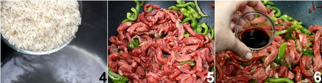 Mientras tanto, puedes poner a hervir una olla de agua y luego echar en ella el arroz basmati 4. Pasado el tiempo de cocción del pimiento, añade las tiras de ternera 5, saltéalas hasta que estén cocidas, condimentándolas con 6 cucharadas de salsa de soja 6.