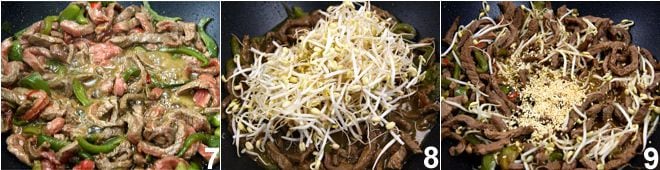 Mezcla entonces con cuidado asegurándote de no romper los pimientos 7. Una vez que la carne de ternera esté cocida, quita el wok del fuego, añade el cebollino picado 8 y los brotes de soja 9, mezcla todo y escurre el arroz basmati. Sirve la ternera picante con el arroz y, si lo deseas, añade más salsa de soja al gusto. Para enriquecer la ternera picante con arroz basmati, puedes añadir una cucharada de semillas de sésamo que hayas tostado para liberar su aroma.