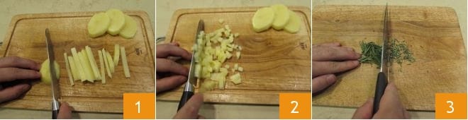 Para preparar la terrina de porcini, comienza con la preparación de las patatas. Lávalas y pélalas, luego córtalas en rodajas y después en tiras 1, y finalmente en cubos 2; resérvalas. Pica finamente el romero 3.