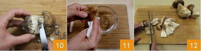 Pasa ahora a la preparación de los porcini: con un cuchillito elimina la parte terrosa rascándola 10. Si los hongos presentan poca tierra, puedes simplemente eliminarla ayudándote con un pincel 11. Corta los porcini en rodajas a lo largo 12.