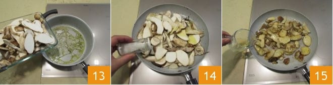 Toma otra sartén antiadherente, calienta un chorrito de aceite con el picado de romero y añade los porcini 13. Ajusta de sal 14 y pimienta. Cocina a fuego moderado durante unos 7-8 minutos, luego rocía con el vino blanco 15.